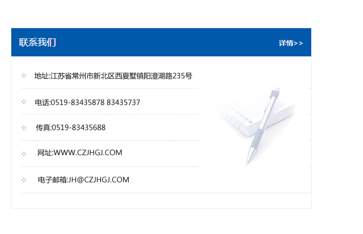 地址:常州市新北區友邦商務大廈1幢16、17層  電話:0519-85101652  傳真:0519-85112595  郵編:213022  網址:www.cz-jiayue_cn.moyandzy.com  郵箱:xiajifengaa@163.com